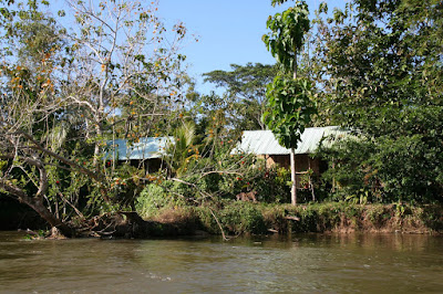 We hebben allemaal een hutje met uitzicht op de San Juan rivier. Sommige zijn echt prachtig, hoog boven de grond, van bamboe opgetrokken jungle-hutten. Ik heb maar een smal oud rijtjes-hutje. Je zit hier midden in de natuur. Reigers vliegen af en aan, overal vogelgeluiden.